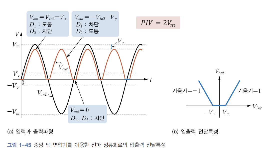 - 중앙 탭 변압기를 이용한 전파 정류회로